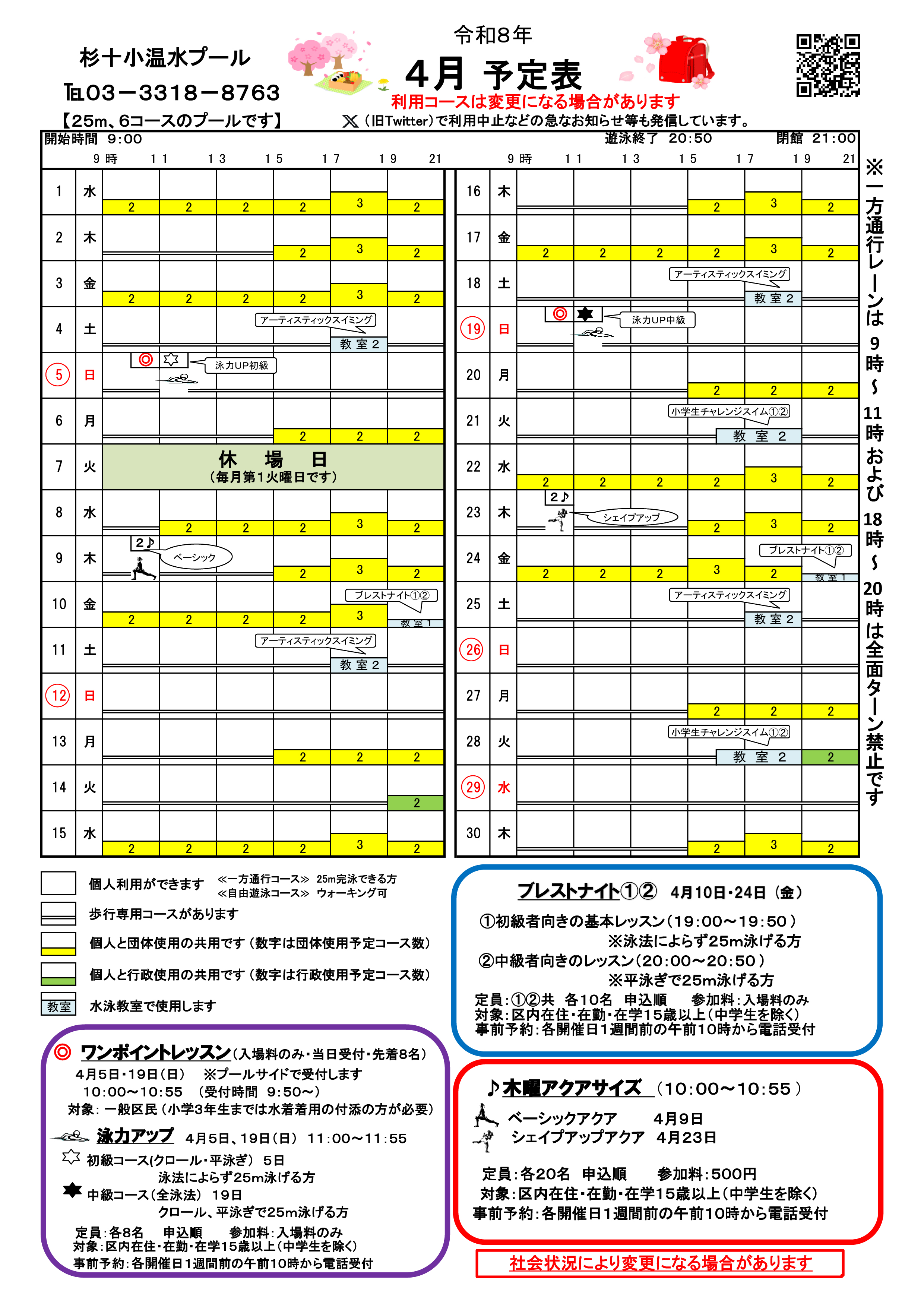 杉並第十小学校温水プールの予定は以下の予定表またはX(旧Twitter)アカウントでご確認ください。